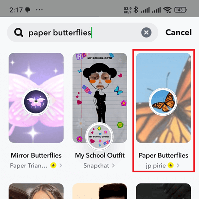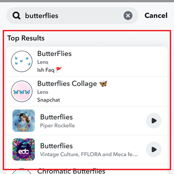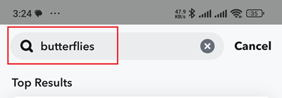 利用应用程序的主要搜索工具是查找“蝴蝶镜头”的好方法。但是,你应该记住,这个过程**可能需要一点时间**,因为你需要搜索 Snapchat 的所有功能。