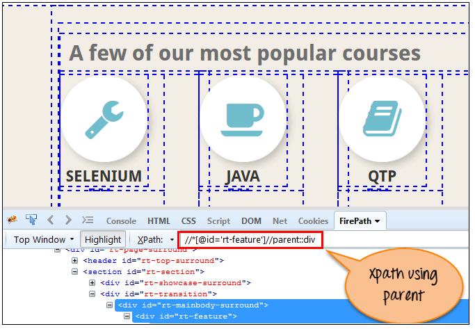 w=driver.findElement(By.xpath("//*[@id='rt-feature']//parent::div"));