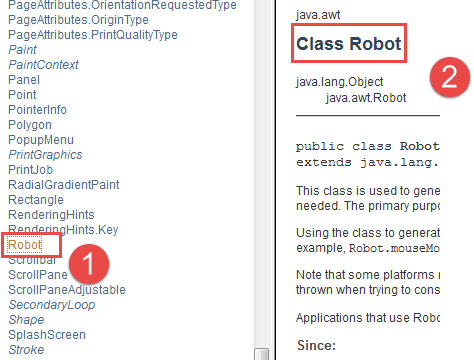 步骤 6) 这里有 awt 包的完整文档,从左侧导航栏点击“Robot”超链接(参见下图中标注 1 的地方)。