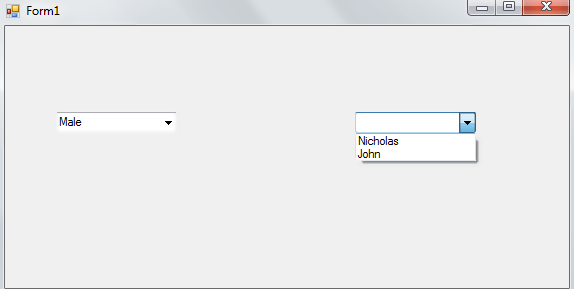 - 当上述条件为真时(即,在 ComboBox1 中选择的项目是 Male),将项目 Nicholas 添加到 ComboBox2。