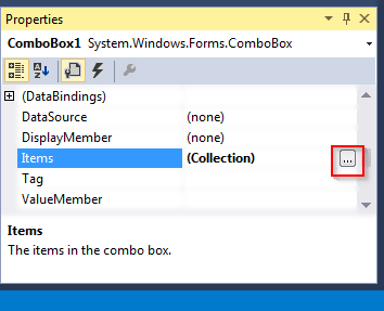我们也可以选择在设计时从属性窗口向组合框添加项目。步骤如下: