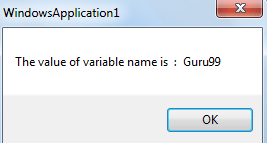 MsgBox("The value of variable name is : " & name)