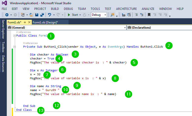 - 创建名为 Button1_Click 的子过程。当点击按钮时,它将被调用。sender 对象将引发事件,而 e 参数将包含事件数据。EventArgs 构成了所有 VB.Net 事件参数的基类。Handles Button1.Click 表示该子过程将处理按钮上的任何点击。