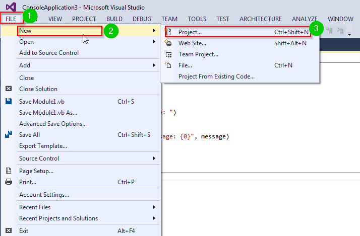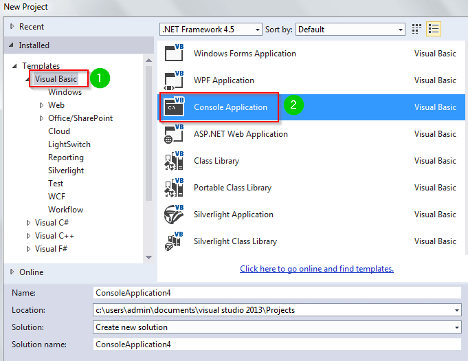 - 在新窗口中,点击左侧垂直导航窗格中的 Visual Basic。选择控制台应用程序。