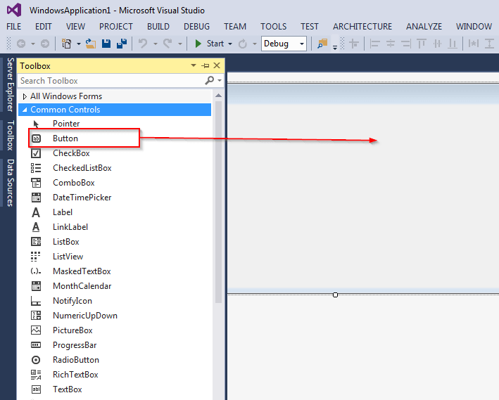 - 将工具箱中的 Button 控件拖到 WindowForm 中