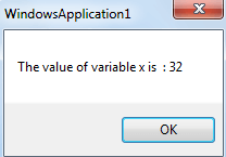 MsgBox("The value of variable x is : " & x)