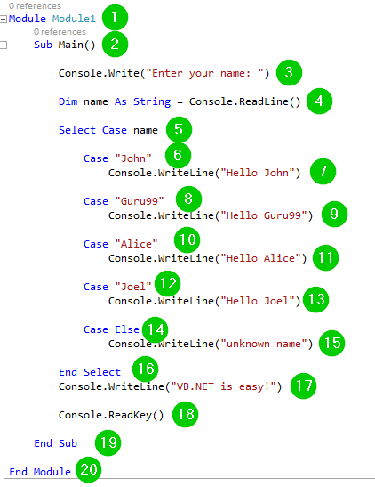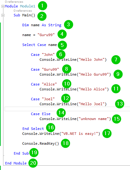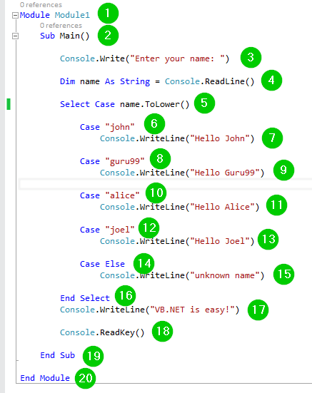代码行 5: 变量name的值将用于与各种Case语句进行比较以找到匹配项。ToLower()函数将确保用户输入的任何名称在评估Case语句之前都首先转换为小写。这意味着如果用户输入Guru99,它将被立即转换为guru99,然后进行Case语句的评估。如果用户输入John,它将在Case语句评估之前立即转换为john。