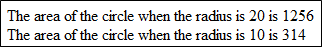 document.write("The area of the circle when the radius is 20 is " & findArea(20) &"<br/>")