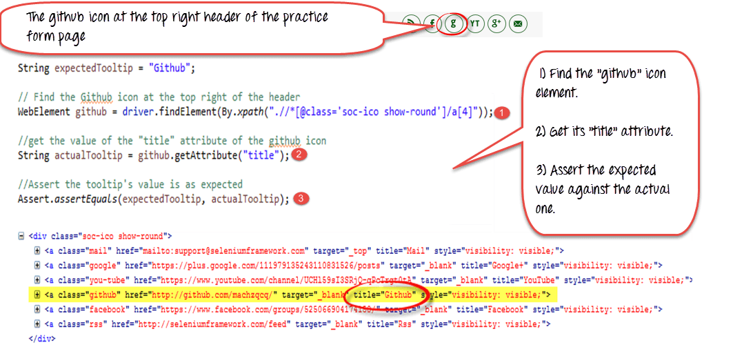 我们将尝试验证页面右上角“github”图标的工具提示。