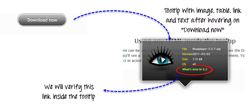 在此 URL 中 – https://demo.guru99.com/test/tooltip.html 您可以看到演示,当鼠标悬停在“Download now”上时,我们会得到一个高级工具提示,其中包含图像、标注背景、表格和内部可点击的链接。