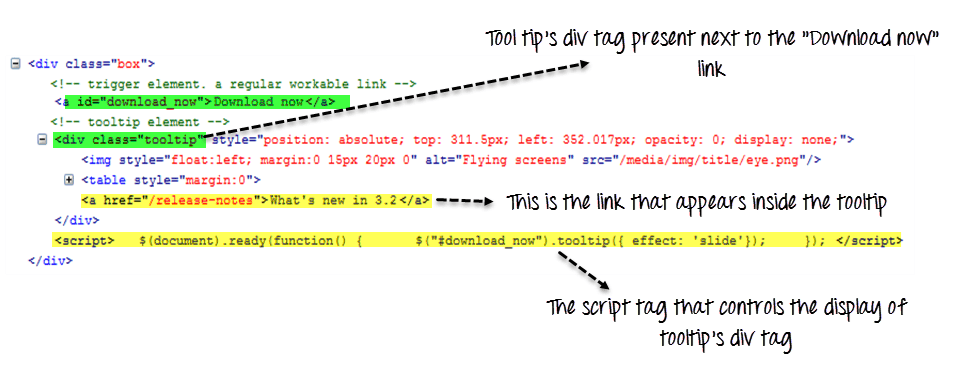 如果您查看下面的源代码,您可以看到表示工具提示的 div 标签始终存在于“Download now”链接标签旁边。但是,脚本标签中的代码控制何时需要弹出。