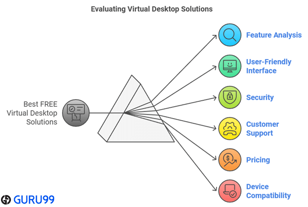 在Guru99,我们优先考虑准确性和客观性,以提供可信赖、可靠的内容。我投入了 120 多个小时来评估 21 多个最佳免费虚拟桌面解决方案,并根据独特功能(包括免费和付费选项)筛选出顶级选项。我的指南提供了经过充分研究的概述,涵盖了优缺点、安全性和定价,以帮助您找到合适的解决方案。请查看下面的重要因素。选择最佳免费虚拟桌面解决方案可能具有挑战性,但我们详尽的研究专注于功能、易用性和支持等关键方面,以提供卓越的用户体验。