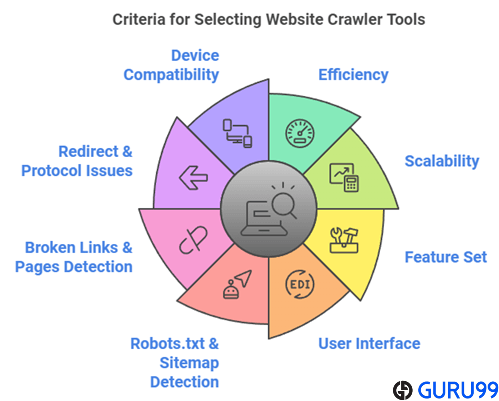 在 **Guru99**,我们致力于通过严格的内容创建和审查流程提供准确、相关和客观的信息。经过 80 多个小时的研究和对 40 多个**最佳免费网站爬虫工具**的探索,我精选了 13 个最佳选择,涵盖了免费和付费选项。这本经过充分研究的指南提供了可靠的见解,可帮助您做出最佳决定。选择网站爬虫工具时,我们关注性能、可用性、速度、准确性和功能。这些要素对于优化网站的爬取功能至关重要,可确保工具高效且易于所有级别的用户使用。