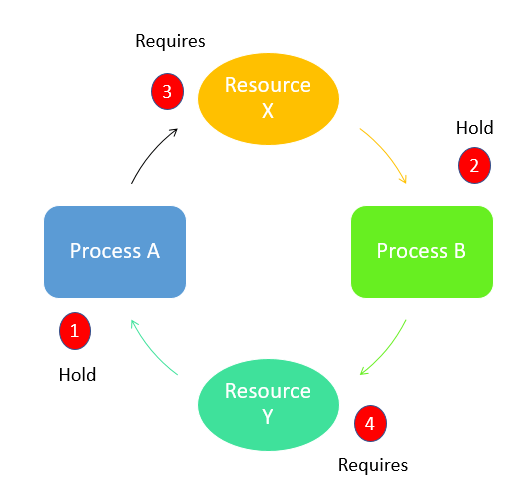 假设进程 A 先运行并获取数据资源 X,然后进程 B 运行并获取资源 Y,无论哪个进程先运行,它们都无法进一步进展。