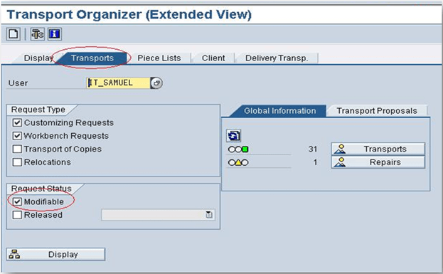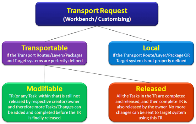 - 传输请求(TR)——是一种在开发系统中进行的更改的“容器/集合”。它还记录了有关更改类型、传输目的、请求类别和目标系统的信息。它也称为变更请求。