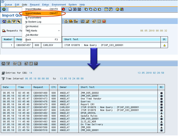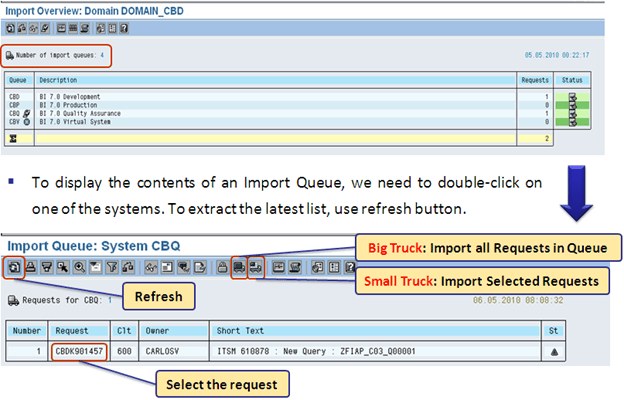 导入队列 -> 是通用目录中可用的 TR 列表,这些 TR 已准备好导入目标系统,这是 SAP 应用视图,在 OS 级别也称为导入缓冲区。