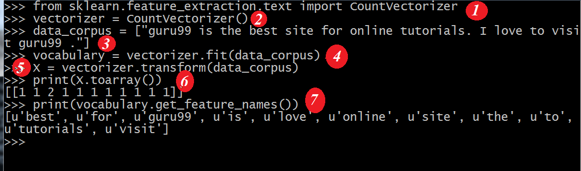 from sklearn.feature_extraction.text import CountVectorizer vectorizer = CountVectorizer() data_corpus = ["guru99 is the best site for online tutorials. I love to visit guru99."] vocabulary = vectorizer.fit(data_corpus) X = vectorizer.transform(data_corpus) print(X.toarray()) print(vectorizer.get_feature_names_out())