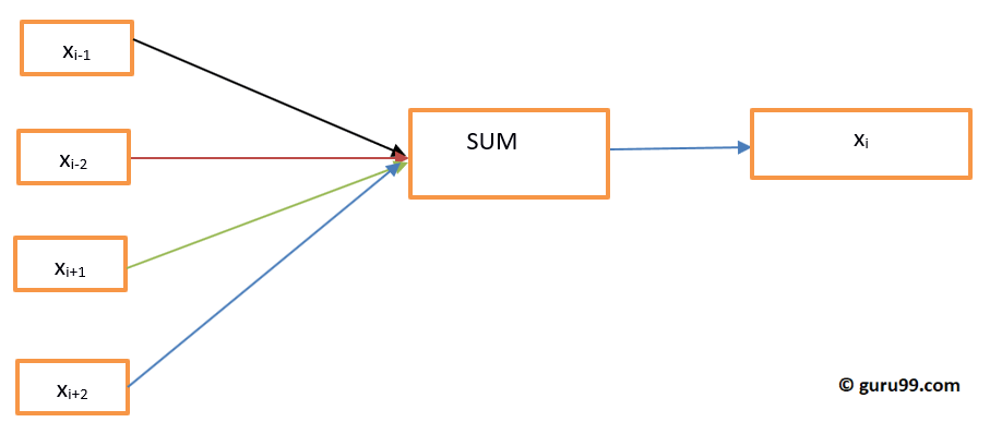 在 CBOW 中,当前词语是使用周围上下文窗口的窗口来预测的。例如,如果给定了词语或上下文 wi-1, wi-2, wi+1, wi+2,该模型将提供 wi。