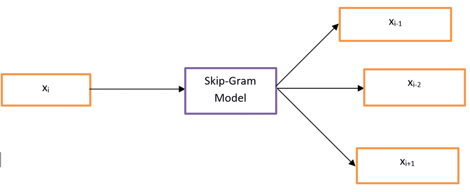 Skip-Gram 的作用与 CBOW 相反,这意味着它从词语预测给定的序列或上下文。你可以反转上面的例子来理解它。如果给定了 wi,它将预测上下文或 wi-1, wi-2, wi+1, wi+2。