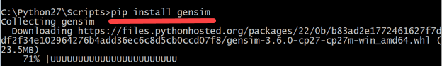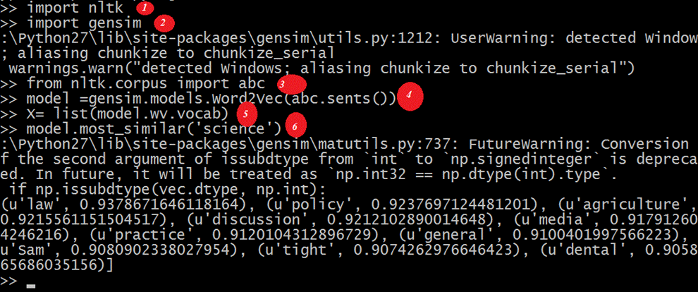 - 导入了 Gensim。如果未安装 Gensim Word2vec,请使用命令“pip3 install gensim”进行安装。请查看下面的截图。