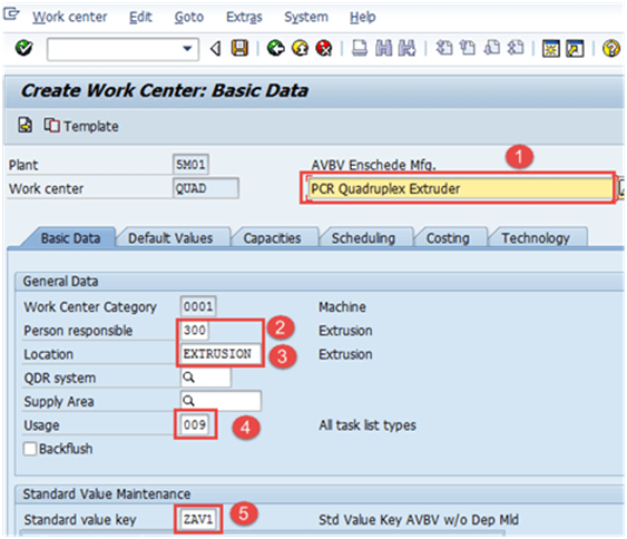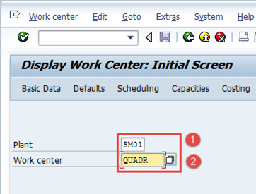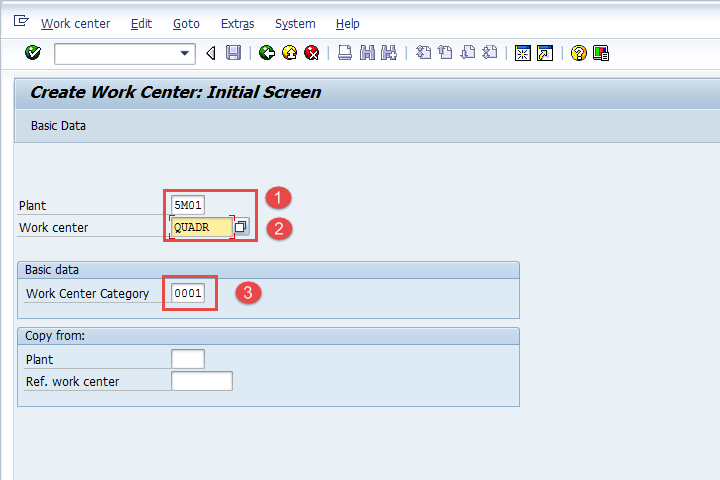 步骤 2)在此屏幕上,将输入工作中心基本数据,如下所示。