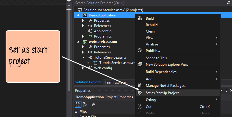 步骤 4) 在此步骤中,您将设置 DemoApplication 控制台应用程序为启动项目。这样做是为了确保在运行整个 Visual Studio 项目时,此应用程序首先启动。此控制台应用程序反过来将调用 Visual Studio 自动启动的 Web 服务。