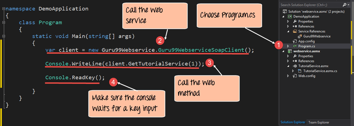 - 然后我们创建一个名为“client”的变量,它将被设置为我们先前步骤中创建的服务引用的实例。在本例中,服务引用为‘Guru99Webservice.Guru99WebserviveSoapClient()’。