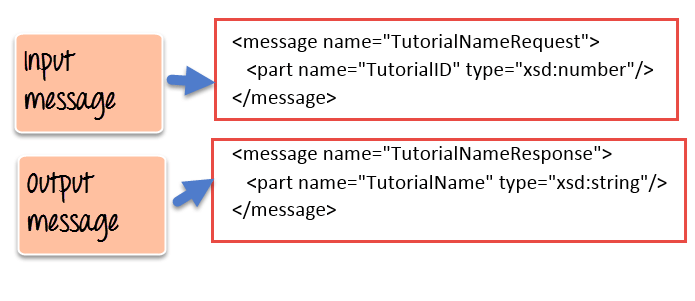 - 输出消息称为 TutorialNameResponse,它有一个名为 TutorialName 的参数。此参数的类型是字符串,由 xsd:string 类型指定。