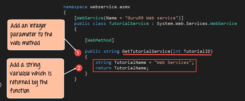 - 这里我们创建了一个名为“Guru99WebService”的 WebMethod。在此 WebMethod 中,我们包含一个整数参数,该参数在每次调用此 WebMethod 时都需要传递。
