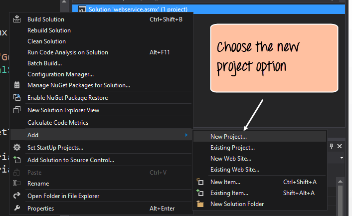 右键单击 Visual Studio 解决方案文件,然后选择“添加”->“新建项目”选项。