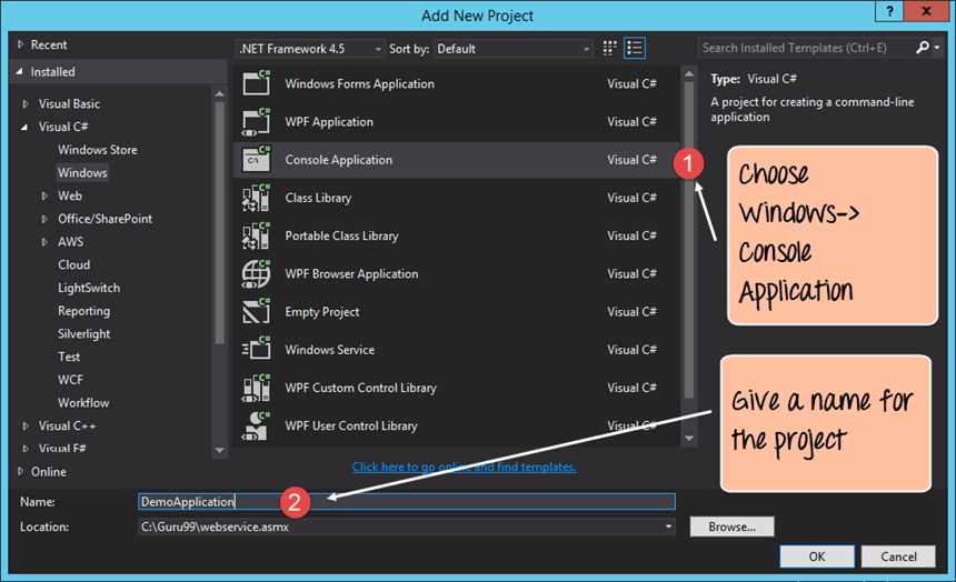 让我们创建一个简单的控制台应用程序,该应用程序将调用此 Web 服务,调用“Guru99WebService”,然后将 Web 方法的输出显示在控制台日志屏幕上。请按照以下步骤创建控制台应用程序。