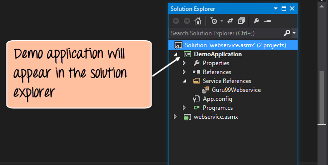步骤 5) 下一步是为我们的控制台应用程序添加“Guru99Webservice”的服务引用。这样做是为了让 DemoApplication 能够引用 Web 服务以及 Web 服务中的所有 Web 方法。