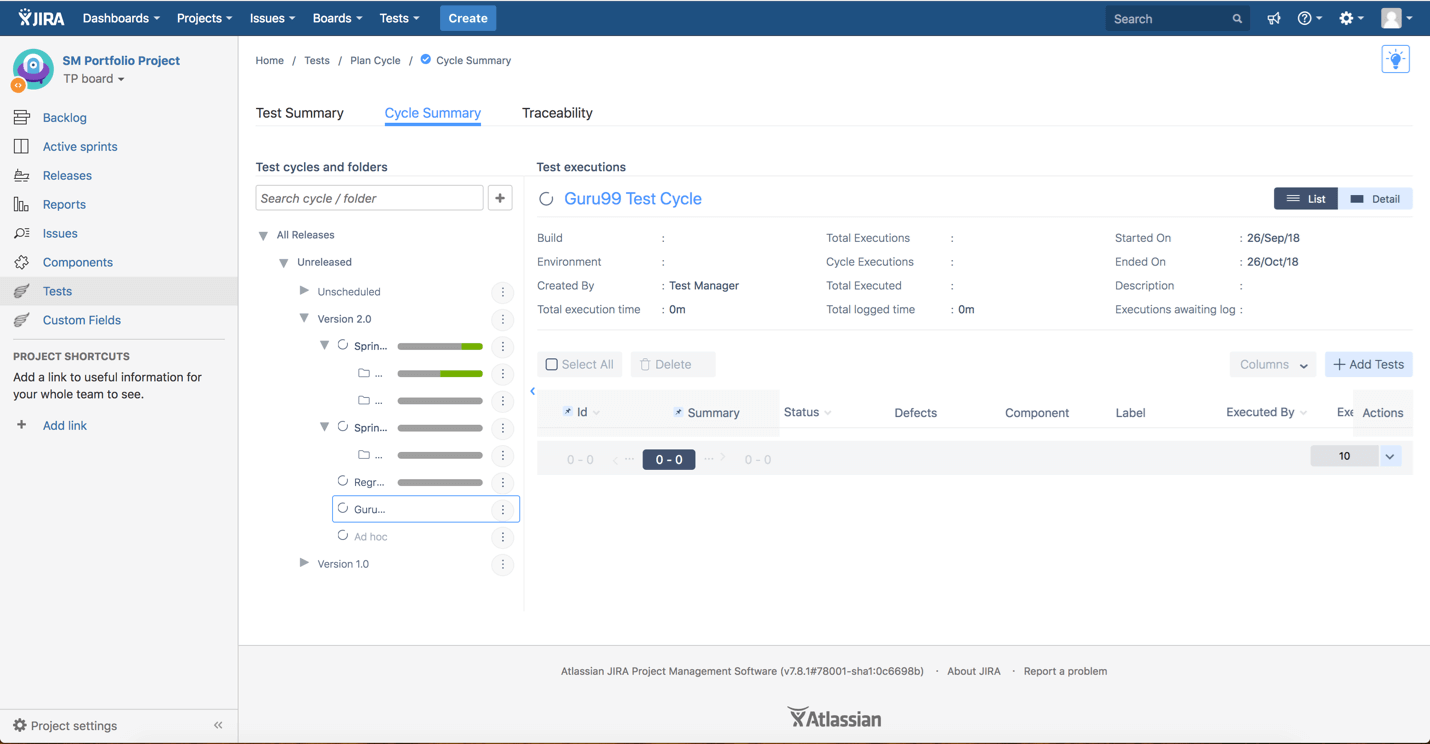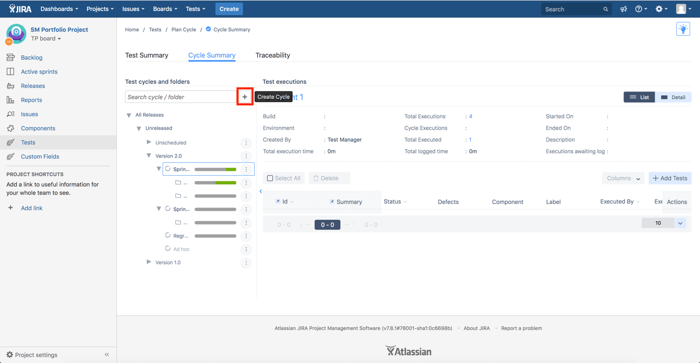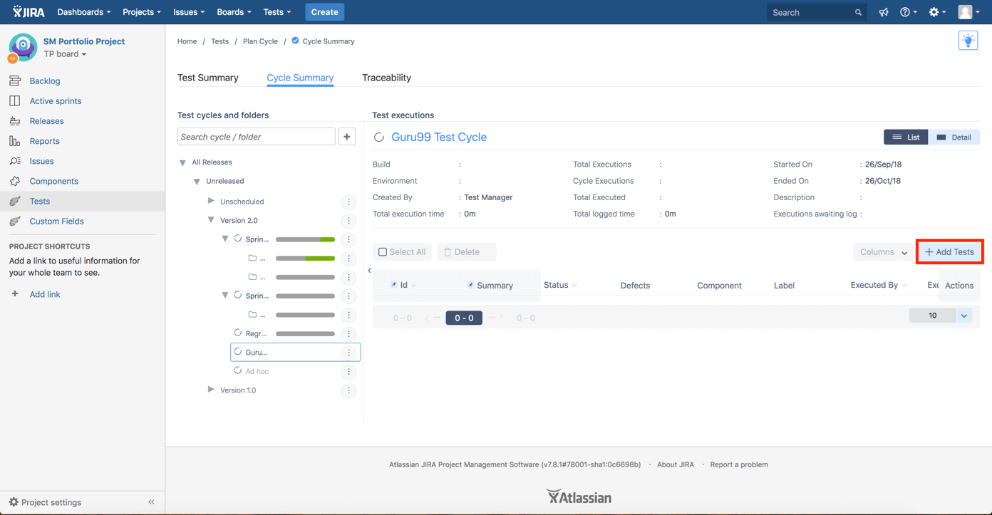- 要将测试用例添加到测试周期中,用户必须位于“周期摘要”选项卡上,然后点击他们想要添加测试的测试周期。完成后,点击界面右侧(位于测试周期测试执行表上方)的“添加测试”按钮。
