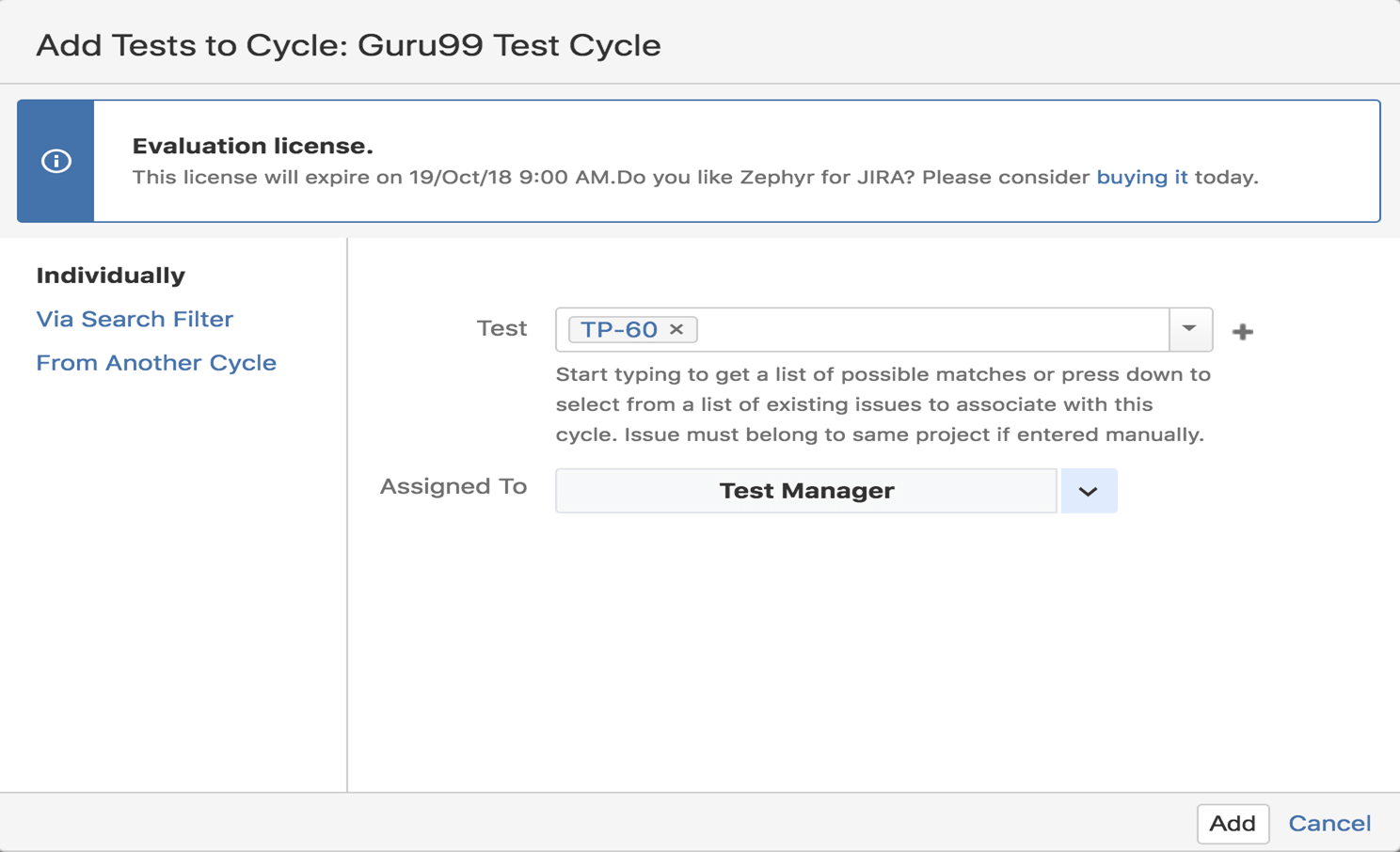 - 这将显示下方的“添加测试”模块。用户随后可以使用下拉列表搜索所有需要添加到周期中的测试用例。您也可以输入测试用例的ID将其添加到要添加的测试用例列表中。选择所有要添加到测试周期中的测试用例后,您必须在JIRA中选择一个您要将添加的测试用例分配给的人员。被分配的人员是测试周期中执行添加测试的初始人员。