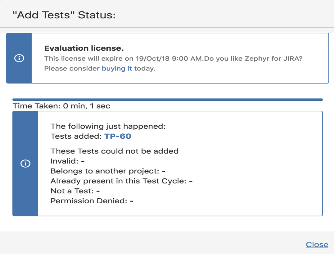 - 这将把所有选定的测试用例添加并分配给JIRA中的个人。一个显示添加测试进度的模块将出现,完成后,只需点击模块右下角的“关闭”按钮。