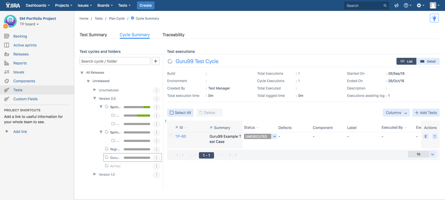 - 添加测试用例后,您可以通过点击测试周期并在表格中查看来查看已添加的测试用例。
