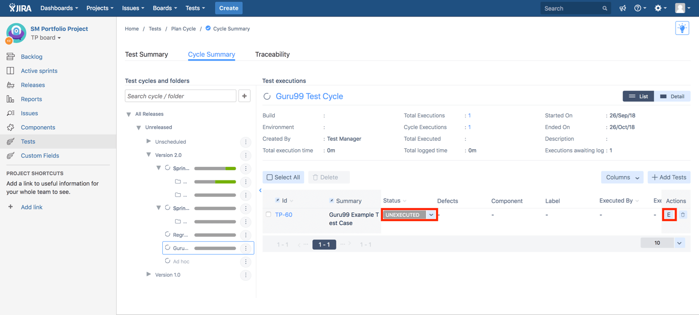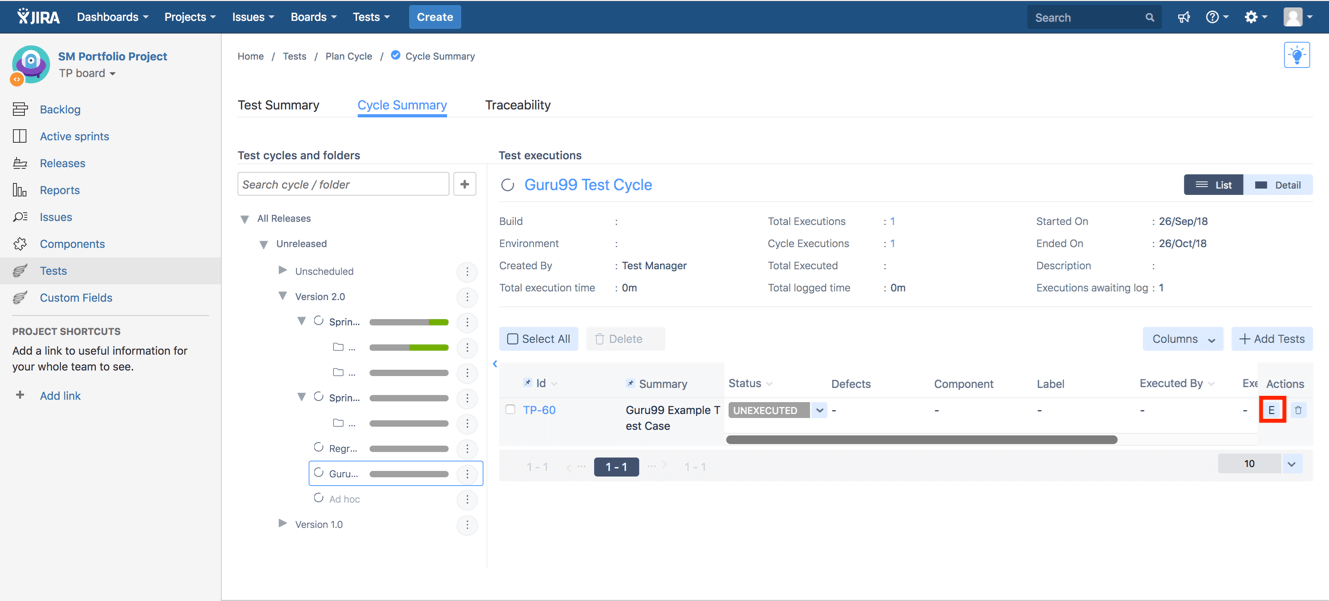 - 用户可以通过在测试周期内的测试执行表的“状态”列中使用下拉列表来快速执行测试用例。用户还可以通过点击需要执行的单个测试的“E”按钮来更详细地执行测试用例。