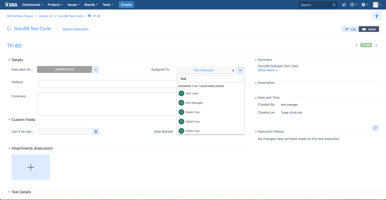 - 这将显示该特定测试的测试执行情况,如果需要,您可以将测试执行分配给不同的用户。这可以通过使用“分配给”下拉列表并选择不同的用户来完成。选择不同的用户后,它将自动保存测试执行。