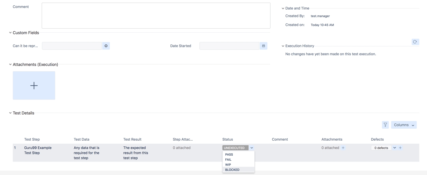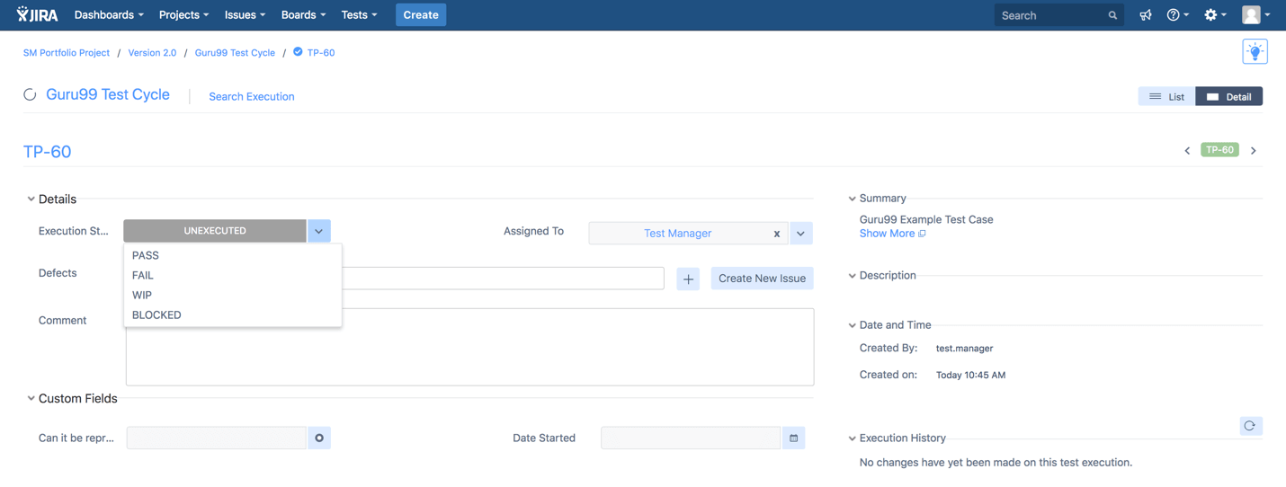 - 点击“E”按钮后,用户可以通过简单地更改和更新测试用例的执行状态来执行整个测试用例。这可以通过使用“执行状态”下拉列表并选择列出的状态之一来完成。这将执行测试用例。