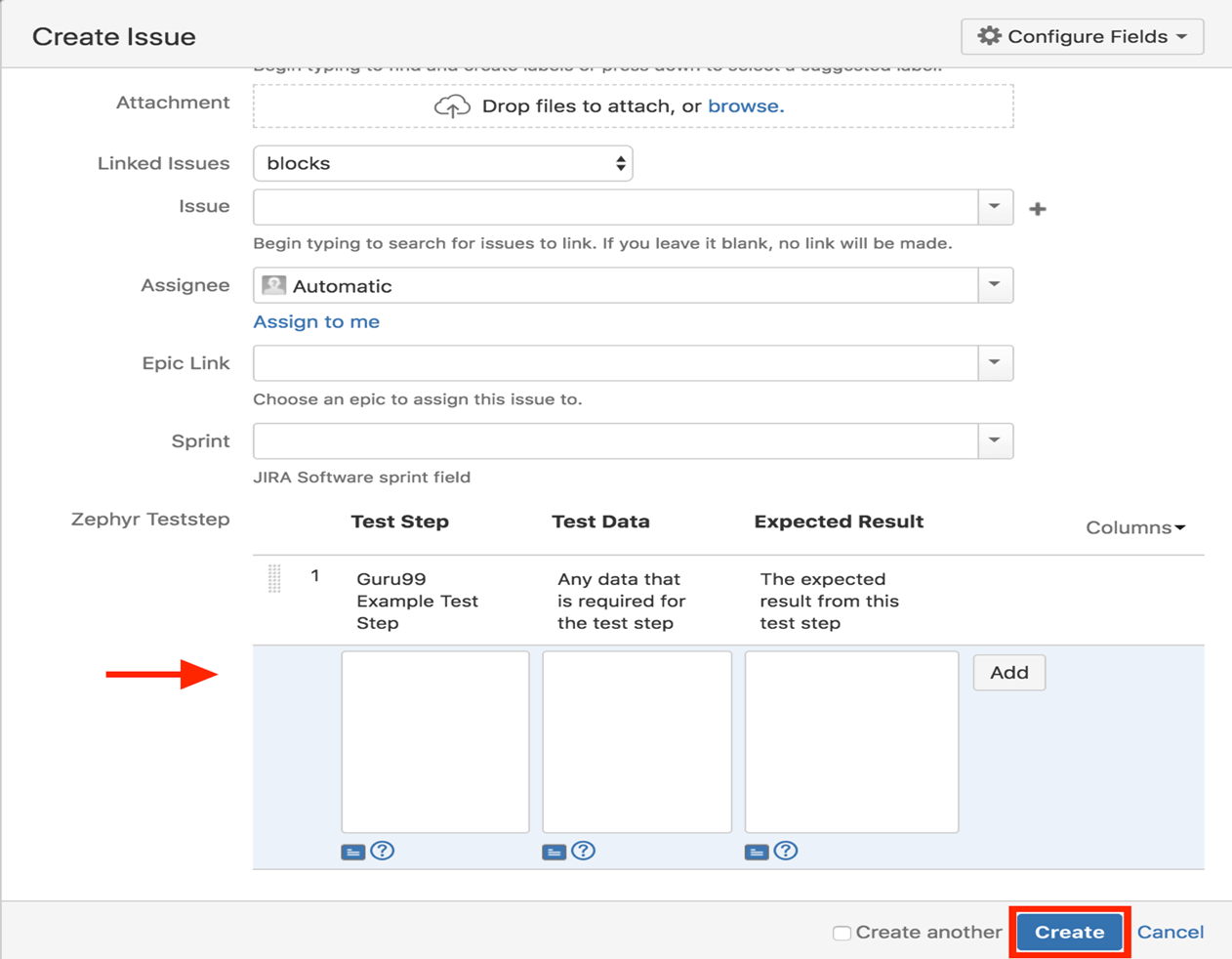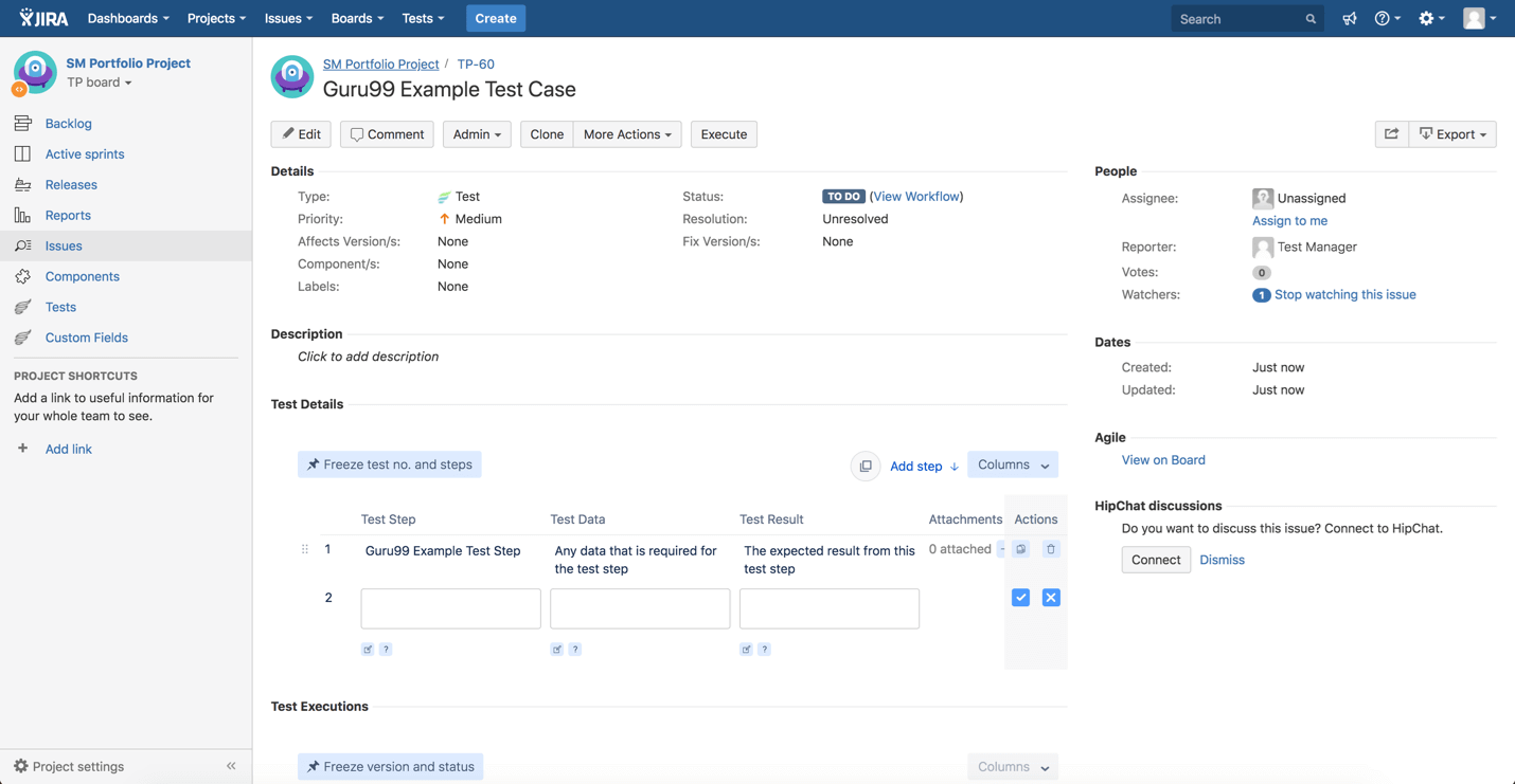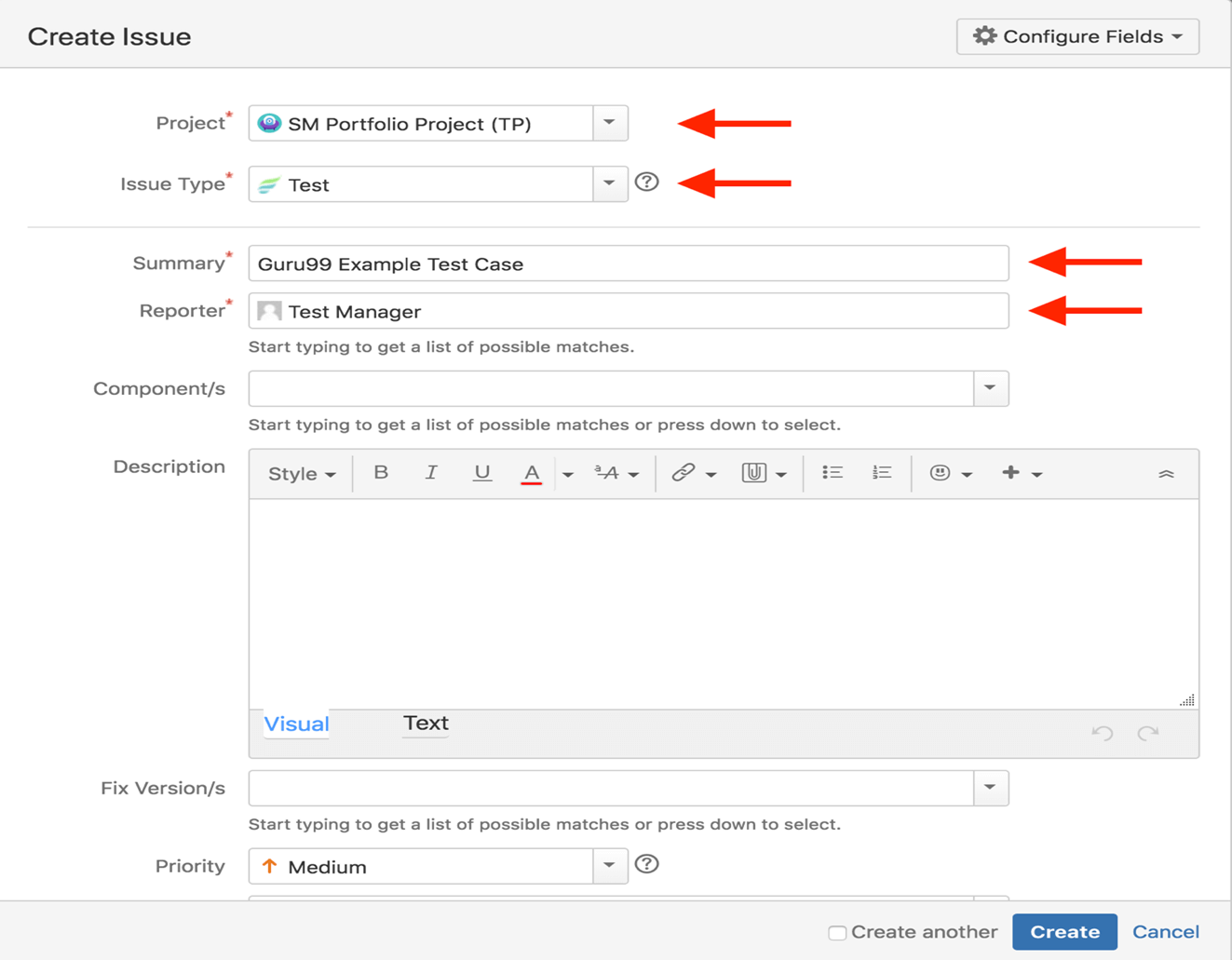 - 问题类型 – 测试用例的问题类型(在本例中,我们将选择“测试”)。