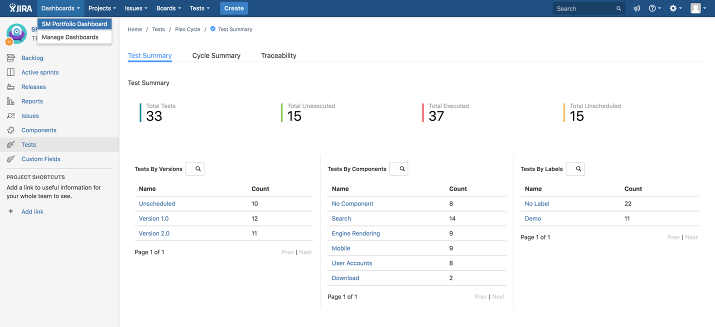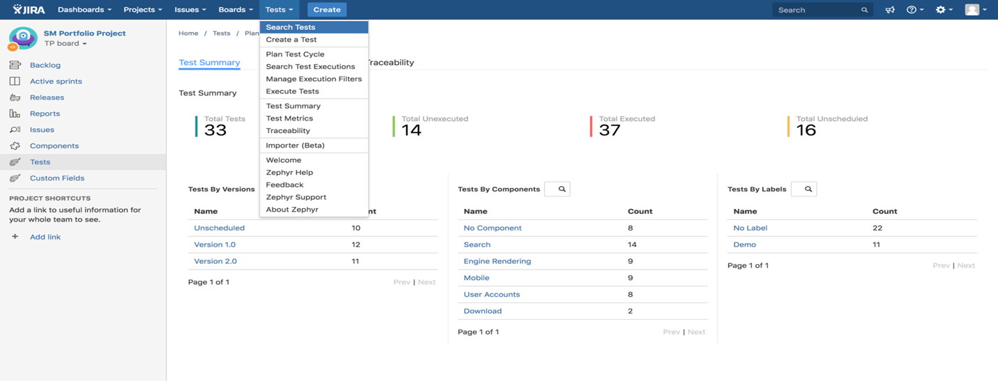 - Zephyr 提供易于使用的仪表板,可提供每个项目中的测试活动的测试指标。