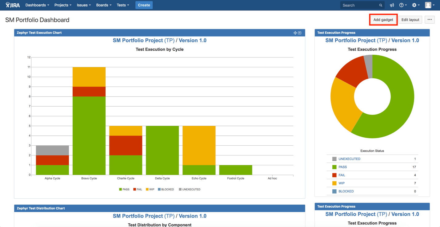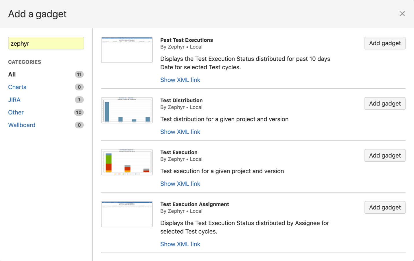 - 这将显示“添加小工具”模块。在这里,您可以通过在界面左上角的搜索栏中输入“Zephyr”来搜索 Zephyr 小工具。之后,您可以查看并选择要添加到仪表盘的 Zephyr 测试小工具。选择小工具后,您只需点击小工具的“添加小工具”按钮即可将其添加到您的仪表盘。这会将小工具添加到您的仪表盘中,以帮助您的用户跟踪和查看所有项目中的测试活动进度。