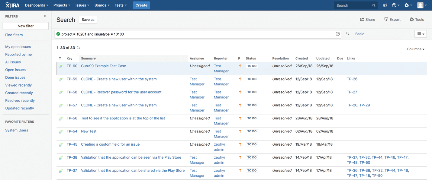 - 这将显示搜索选项,该选项为Zephyr的ZQL提供了搜索所有测试用例的参数。单击要查看和修改的测试用例的“摘要”。在本例中,我们将选择“Guru99示例测试用例”。