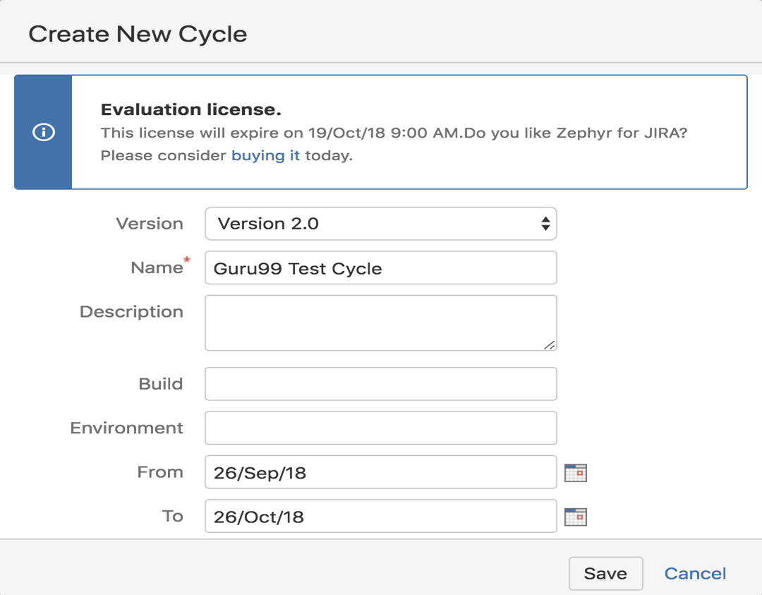- 到 – 测试周期的结束日期。结束日期不一定强制执行(用户可以继续向测试周期添加测试并在该日期之后执行它们)。